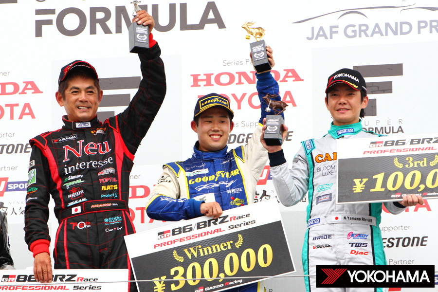 二人の攻防は最終ラップまで続いたが、0.3秒差で織戸選手が逃げ切って前戦の富士スピードウェイから連続の表彰台を獲得。3位には9台をパスした山野選手が入り、こちらも織戸選手とともに表彰台を飾った。
