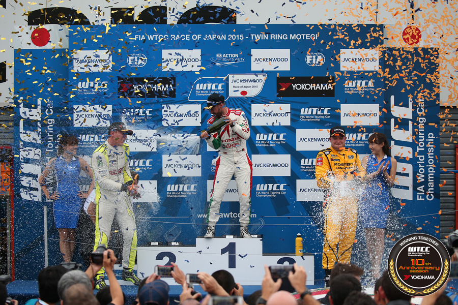 そんなバトルを尻目にトップを快走したモンテイロ選手はそのままチェッカードフラッグまでマシンを運び、ホンダのホームコースで嬉しい自身今季2勝目を飾ることに成功。2位はYOKOHAMAトロフィーの最上位となったヒューゴ・ヴァレンテ選手で自身WTCC最上位という嬉しい結果を残した。そして3位は猛追から逃げきって、ハフ選手が表彰台を獲得した。なお、この日本ラウンドでの結果により、残り3大会となった今季のWTCCは、選手権タイトル争いはロペス選手、ミューラー選手、ローブ選手とシトロエンの3人に絞られることとなった。