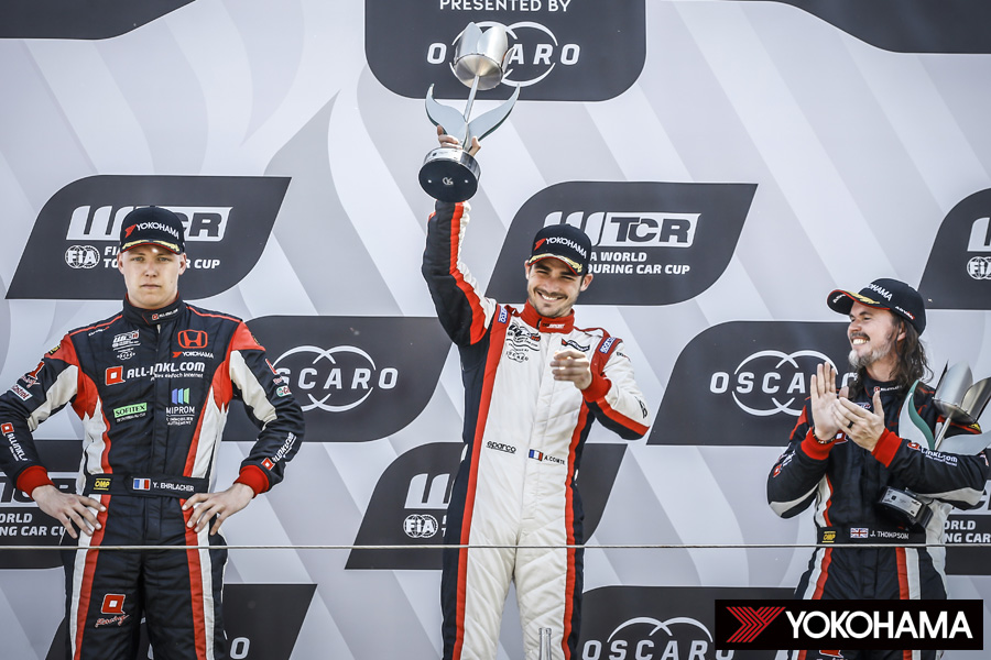 30分ほどの長い中断をはさみ、セーフティカーの先導でレースは再開。中断時点でトップだったエアラッシ選手はセーフティカー解除後もトップをしっかり守り、12周目からの2回目のセーフティカー後もポジションを譲ることなくチェッカーまでマシンを運んで第2大会・ハンガリーのレース1以来となる2勝目を飾った。これに続いたのはコンテ選手、こちらは嬉しいWTCR初表彰台を獲得した。