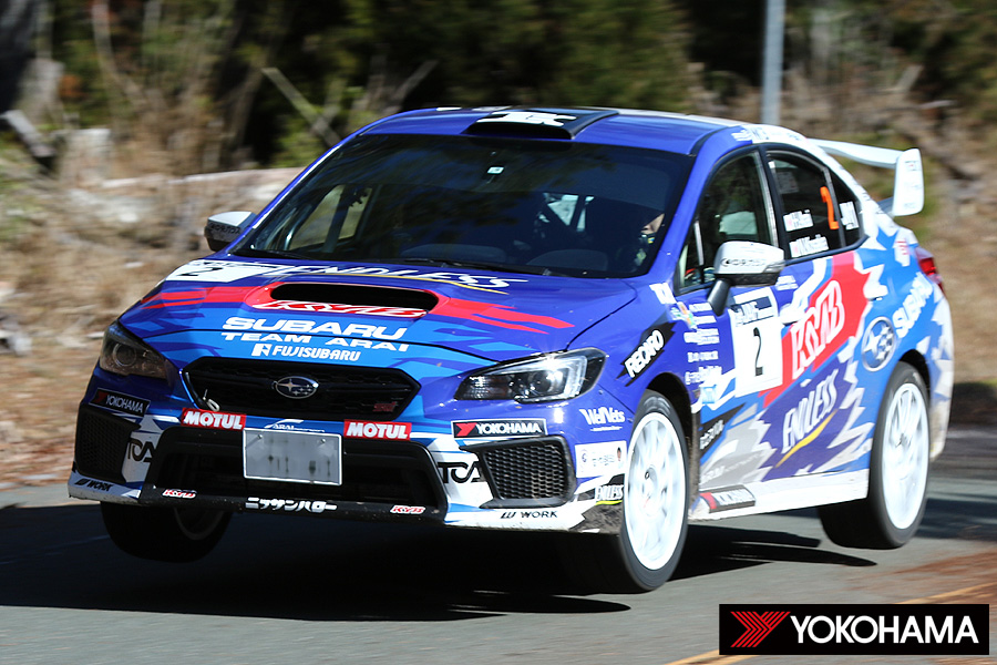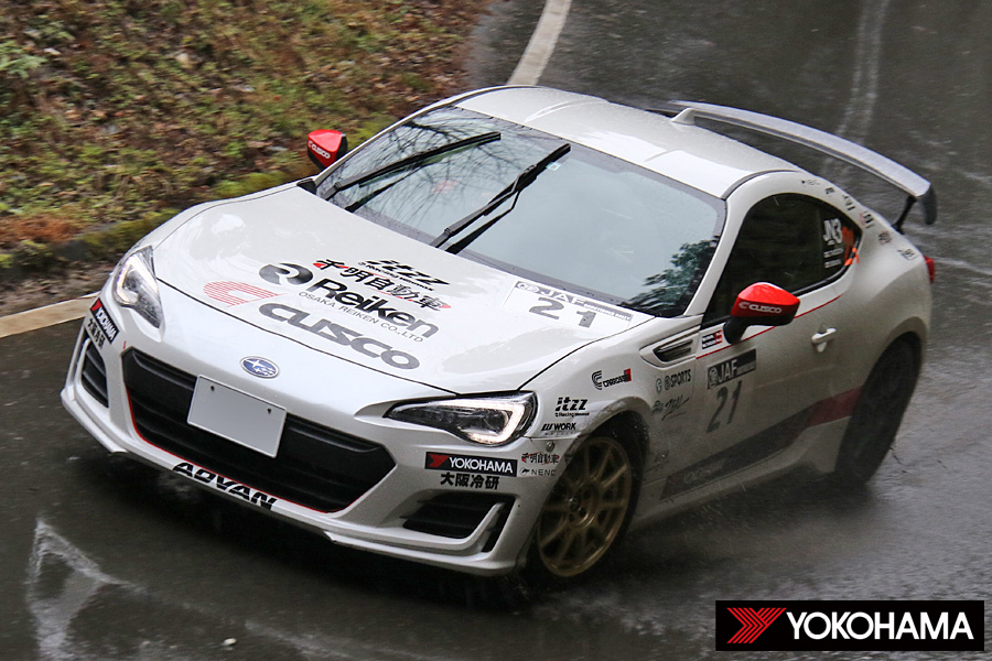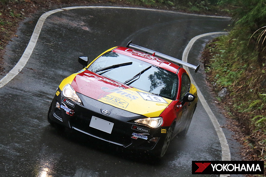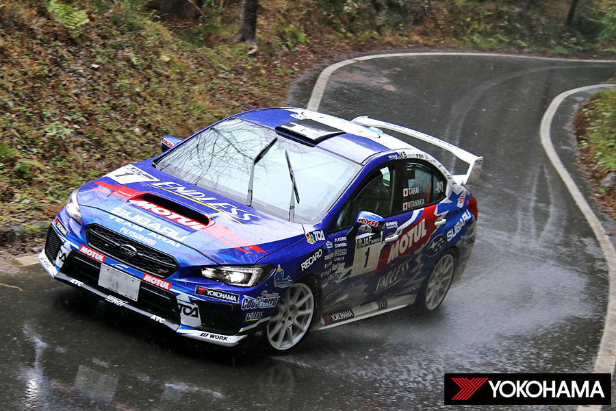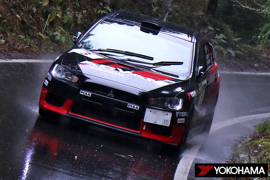 注目のオープニングステージとなる「舟着 1」、この道は他のステージと比べて舗装が新しく、ところによっては油分が残っている状態。さらにウェットということで非常にスリパリーだったが、そんな中で速さを見せたのは「ADVAN A052」を装着するヨコハマタイヤ勢。ステージベストを奪ったのは奴田原文雄選手/佐藤忠宜選手組(ランサー)で、セカンドベストの新井(敏)選手組を6.2秒上回る速さを見せた。そしてサードベストは柳澤宏至選手/保井隆宏選手組(WRX STI)、4番手が新井大輝選手/小坂典嵩選手組となり、ヨコハマタイヤ勢がベスト4を独占。このあとも快走は続き、奴田原選手組はSS2「ほうらいせん一念不動 1」とSS3「鬼久保 1」もステージベストを奪ってセクション1を完全制覇。