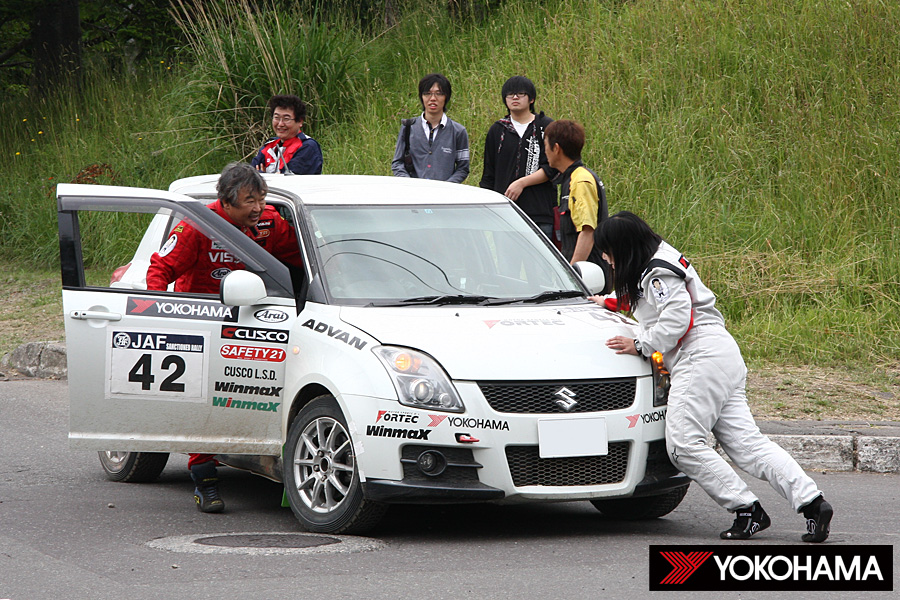 そんな中で緒戦から強さを見せたのが、ベテランの田中伸幸選手と藤田めぐみ選手のコンビ。北海道在住の田中選手と九州の藤田選手は初のコンビとなるが、準備時間があまり取れなかったとは思えない息のあった戦いぶりで開幕戦を制することに成功。グラベル(非舗装路)ラリーの第3戦・福島で連勝を飾ると(第2戦・愛媛はクラス不成立)、第4戦の北海道洞爺も快調にトップを走ったが、Day2で駆動系トラブルに襲われてしまう。しかしクルー自らが手押しでサービスまでマシンを運んで修復、惜しくも2位となったものの執念でポイントを獲得。