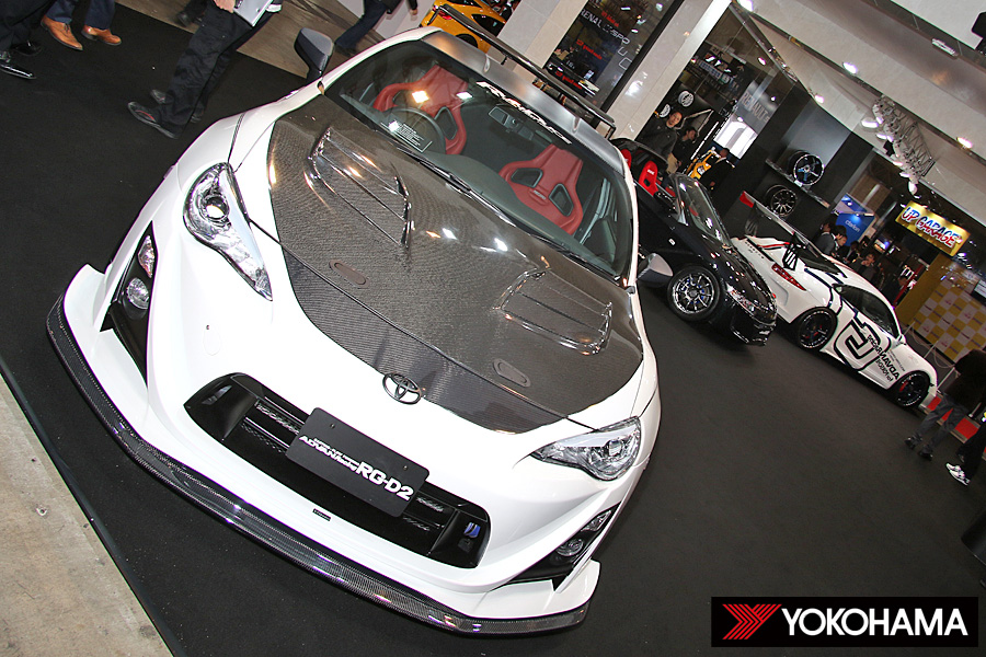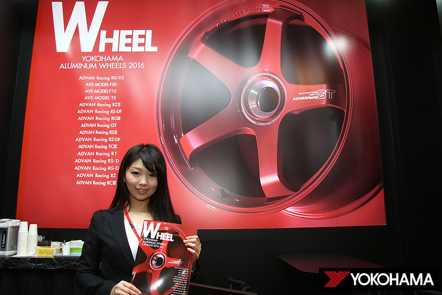 シックなモノトーンの色使い、壁一面にディスプレイされたラインアップ。ヨコハマホイールのブースは、今年もお馴染みのハイセンスなコーディネートで東京オートサロンの会場において一際存在感を見せていた。このブースでは、2016年のニューアイテムとして4商品を発表。3台のデモカーを展示した。