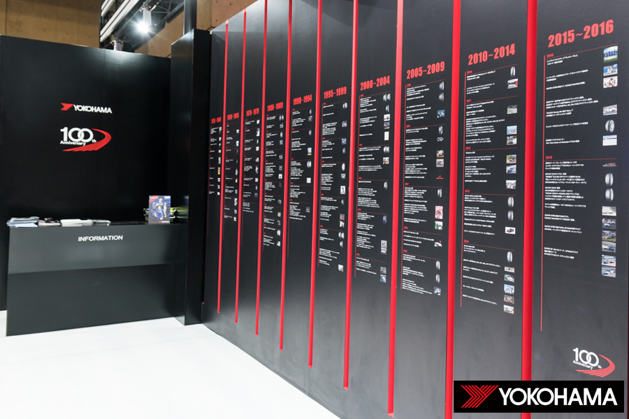 また、ブース内には横浜ゴムの100年間の歩みを紹介するパネルコーナーを設置。その中では国内外のモータースポーツシーンで華々しい活躍を見せてきたヨコハマタイヤ装着車も紹介、レース、ラリー、スピード行事など幅広いカテゴリーを支えてきた横浜ゴムのモータースポーツ活動についてご覧いただいた。