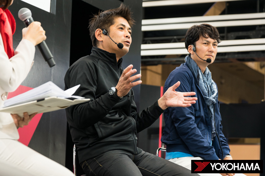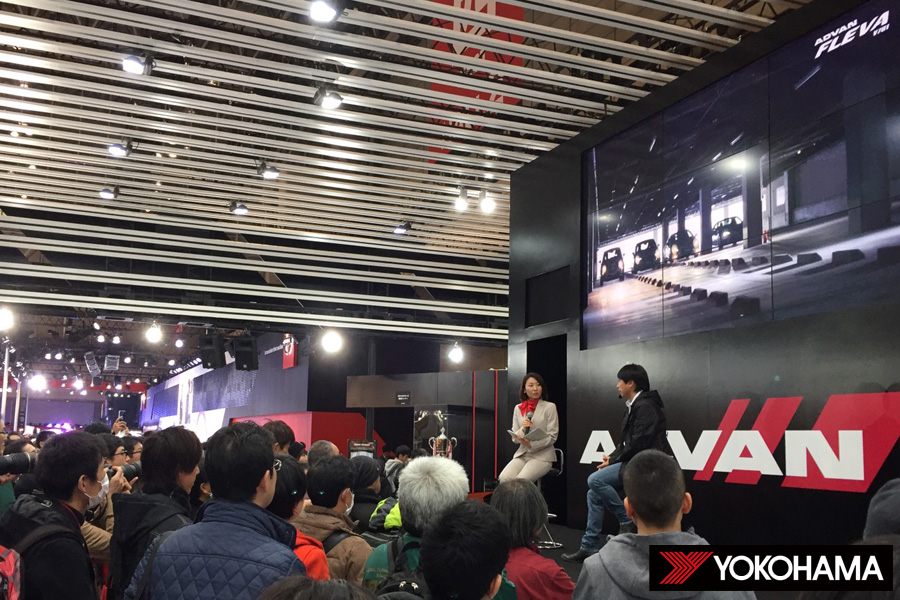 土曜日には「ADVAN FLEVA V701」の開発ドライバーをつとめていただいた、片山右京さんによるトークショーを開催。さらに日曜日には「ADVAN A052」の開発ドライバー・柴田優作選手とタイヤエンジニアによるトークセッションも行い、開発現場の模様や裏話も披露されて会場は大いに盛り上がりを見せていた。
