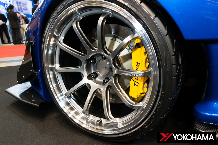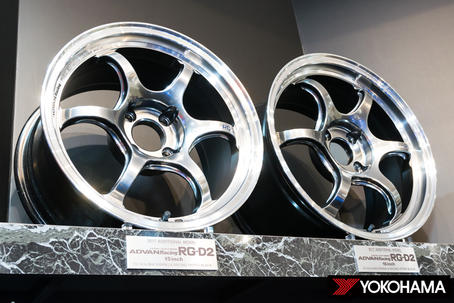 今回の東京オートサロンでは、「ADVAN Racing」をメインに展示。フラッグシップモデルの「ADVAN Racing GT」では21インチ、「ADVAN Racing RS-DF PROGRESSIVE」では19インチ、さらに「ADVAN Racing RG-D2」では15、16、17インチと、それぞれの新サイズをお披露目した。