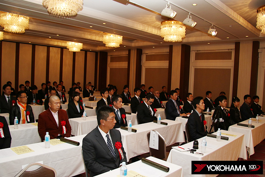 朝から清々しい青空に恵まれた東京、表彰式には40名の受賞者の方々にご出席をいただきました。式は主催者を代表して横浜ゴム株式会社モータースポーツ推進室長・阿部義朗の挨拶で開会、各カテゴリーでヨコハマタイヤをお使いいただいて活躍されたみなさんに、表彰状を贈呈しました。