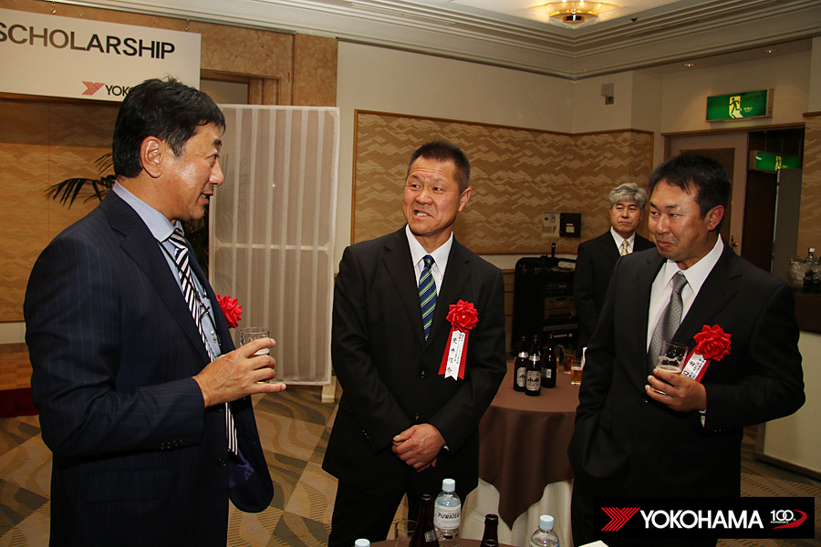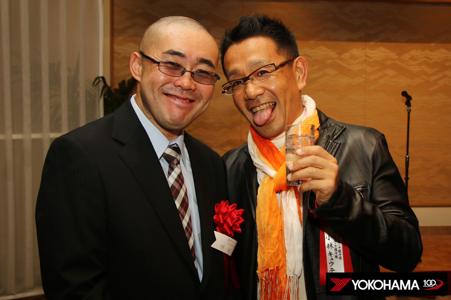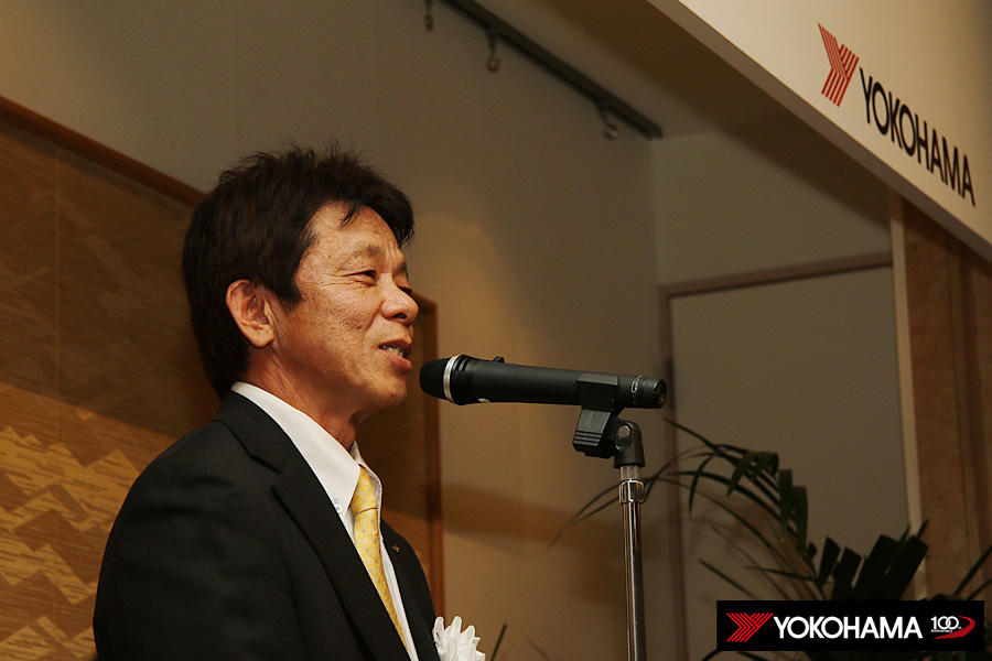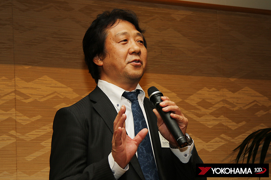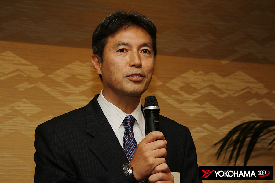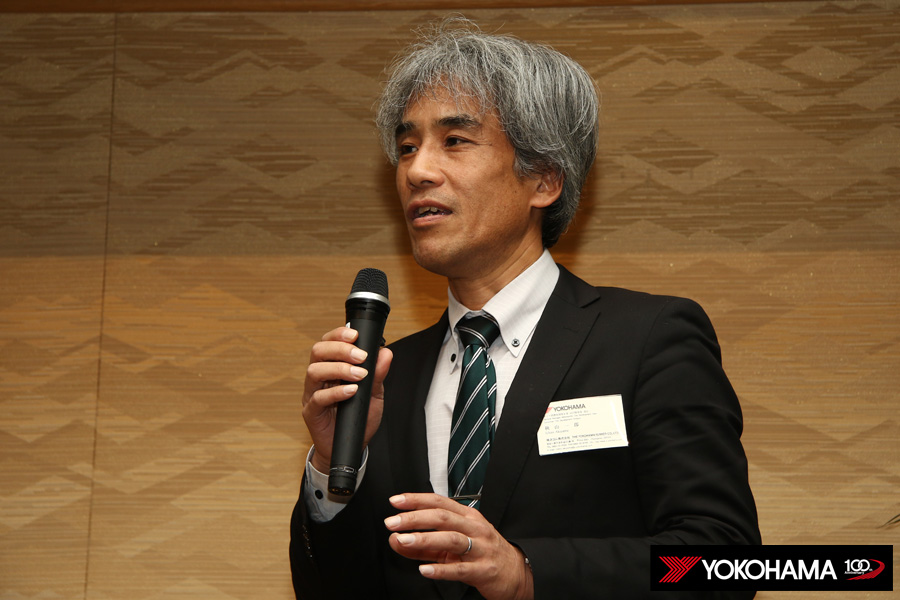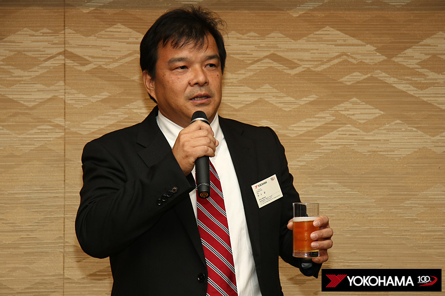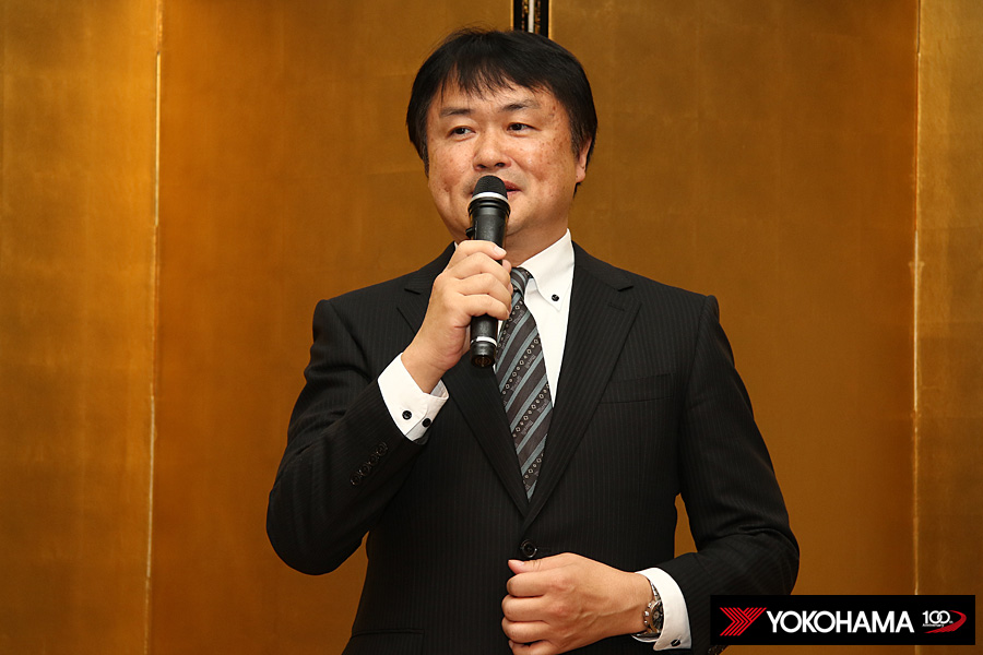 ヨコハマタイヤのスタッフも各テーブルをまわって、選手のみなさんと親睦を深めていきます。もちろんタイヤに対するご質問にお答えしたり、みなさんから寄せられた忌憚の無いご意見やご要望にも真摯に耳を傾けていきます。懇親会の中では開発を担うMST開発部長の秋山一郎とMST開発部技術開発2グループリーダーの山根賢司も挨拶、これからもみなさんの戦いを足元からしっかり支えていく思いが改めて伝えられました。