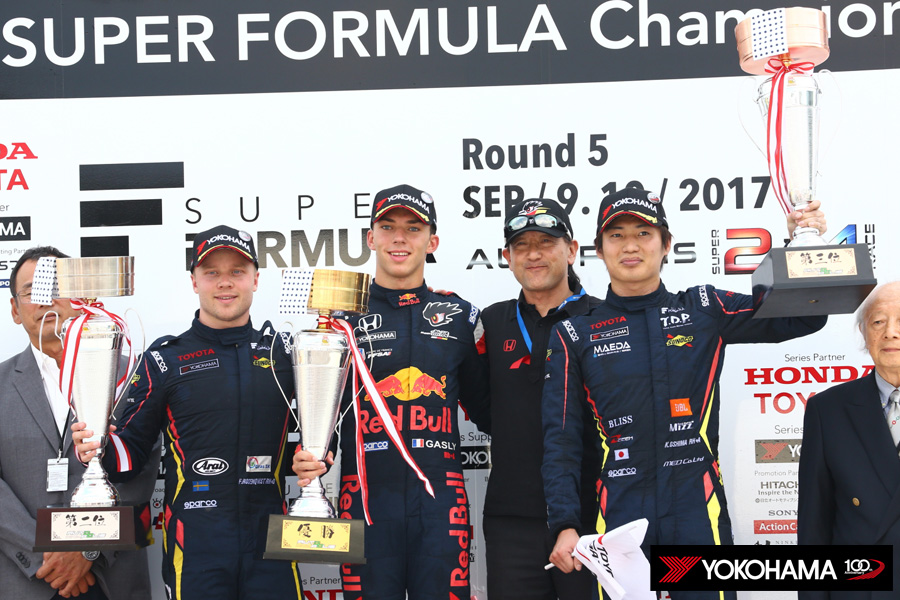 シーズンは後半戦に突入、第5戦は九州のオートポリスが舞台となった。2016年は熊本地震の影響で開催が中止されたため、ヨコハマタイヤを装着したSUPER FORMULAにとってオートポリスはこれが初めての大会となる。前戦に続いてソフトコンパウンドタイヤも供給、2スペックを如何に使うか戦略も見どころとなった一戦。そんな中で前戦の勝者、ピエール・ガスリー選手はスターティンググリッド上でミディアムからソフトへとタイヤを交換。5番手スタートから一気に2番手にジャンプアップ、接戦から先にピットインしたガスリー選手はミディアムに交換して戦列に復帰。対するトップの野尻智紀選手はファーストスティントを引っ張ったが、ガスリー選手が猛プッシュで逆転に成功して見事な二連勝を飾った。