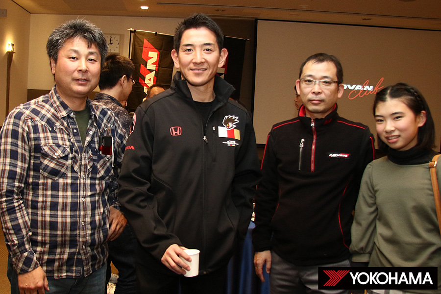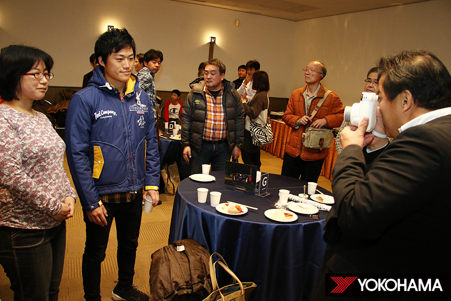 乾杯の後はゲストドライバーやヨコハマタイヤスタッフが各テーブルをまわり、ご参加いただいた皆さんと親睦を深めていきます。普段なかなか直接話をする機会の無いドライバーに質問をぶつけたり、写真撮影やサインをもらったりと、参加者の皆さんに短い時間ではありましたが楽しいひとときをお過ごしいただきました。