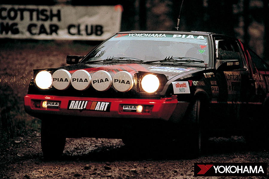 さて、1980年代中盤になると、Red in BlackのADVANカラーも現在に通じる斜めの赤いストライプが定着し、“赤と黒=ADVAN=ヨコハマタイヤ”というイメージは誰もがモータースポーツシーンにおいて欠かせない風景のひとつと認識するところになった。そんなADVANカラーをまとう歴代ラリーマシンのうちの1台、1985年に投入された三菱・スタリオンの鮮烈な印象は今も伝説的に語り継がれている。